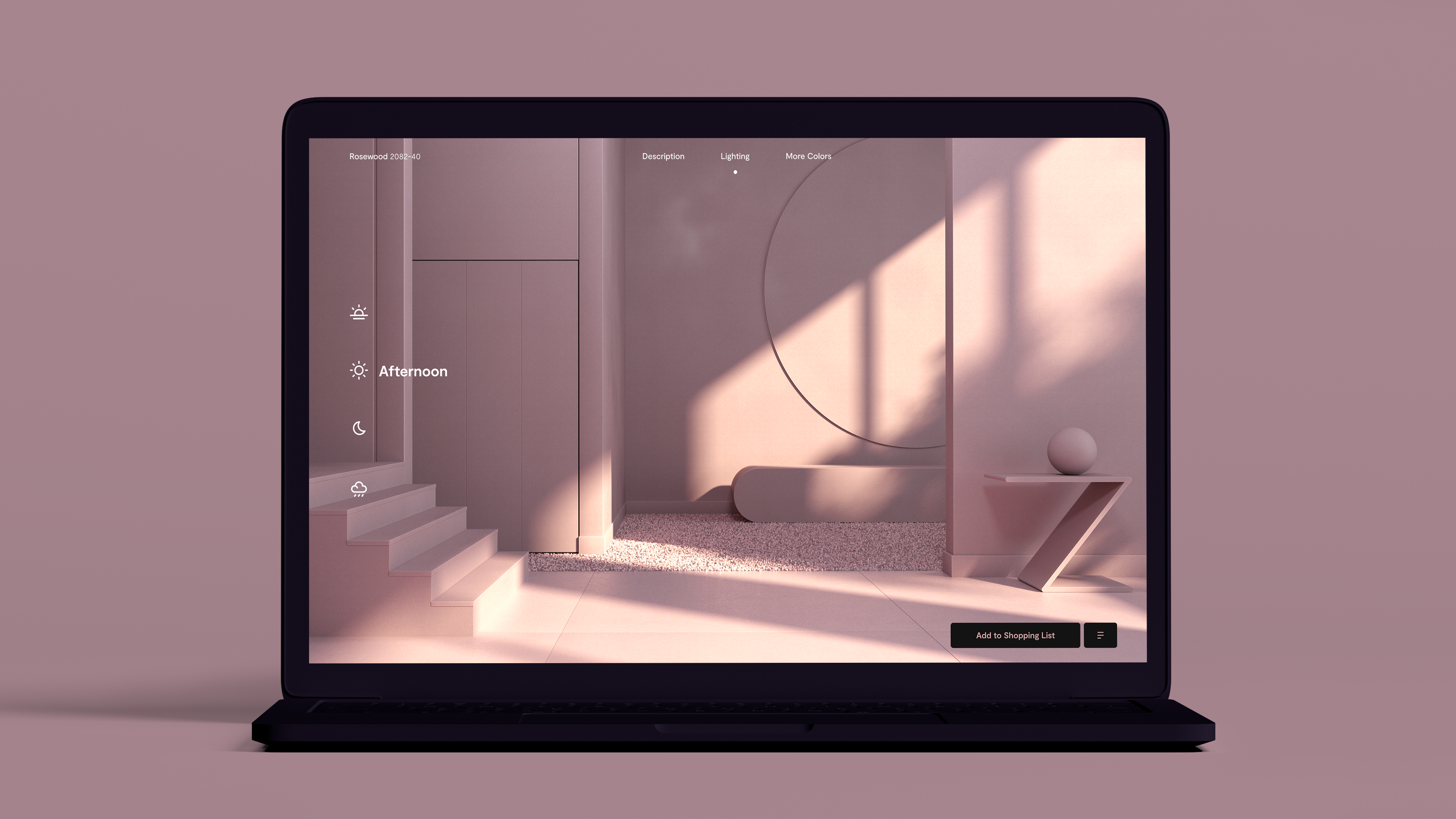 Each color page includes an interactive 3D scene where the customer can see how the color changes based on the lighting and time of day.