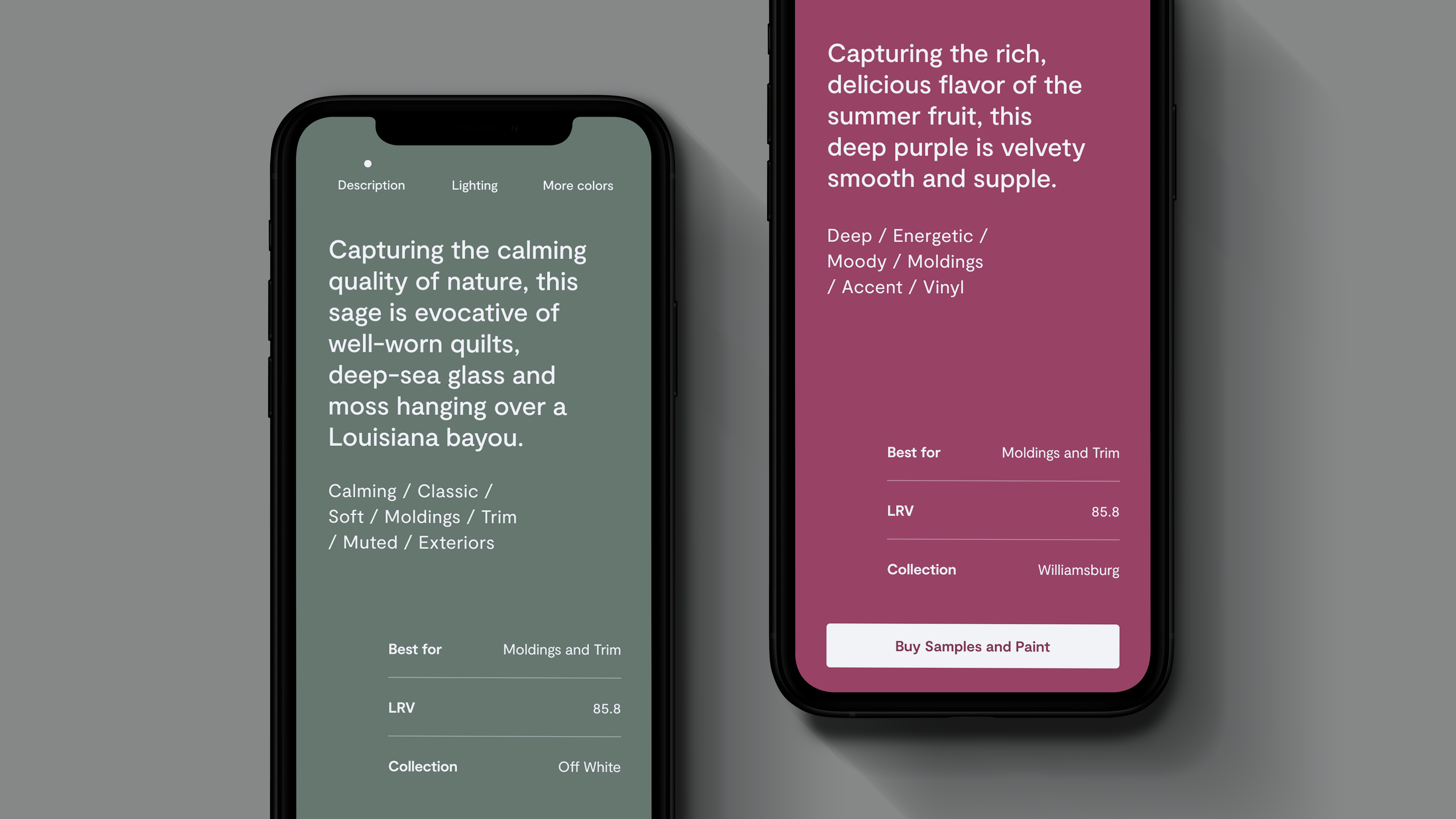 The Color Finder is Benjamin Moore’s first web and mobile experience that helps customers navigate through their expansive library of 3,500 colors to find the perfect one. Each color has their own detail page where customers can immersive themselves in the hue, technical details, view photos, and even find colors that are complementary to it.
